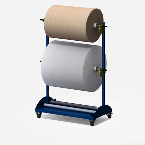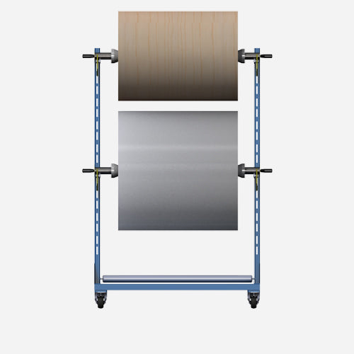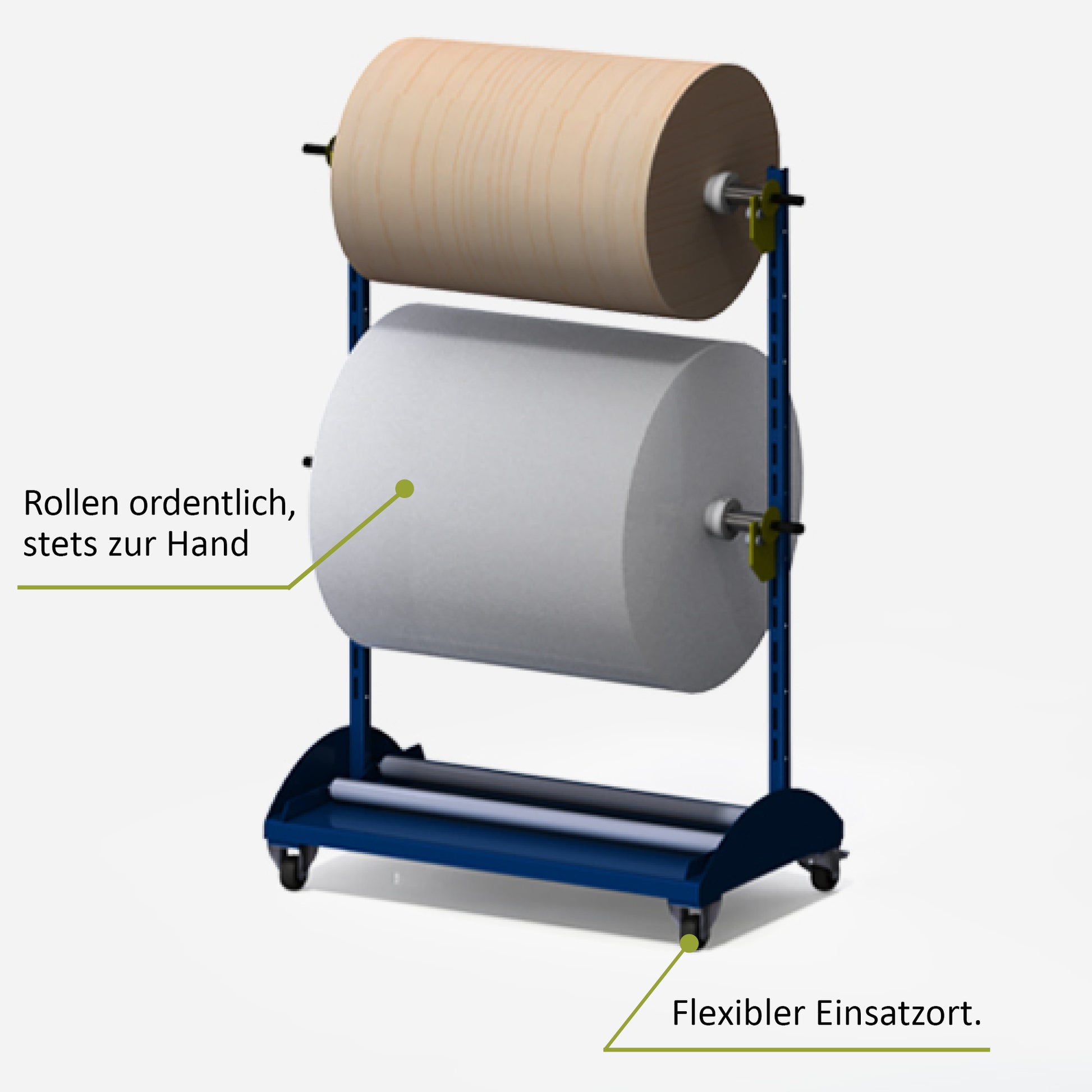 - Aufnahme von 2-3 Rollen: 2 Rollen können variabel mittels Steckachse positioniert werden, im unteren Bereich lässt sich eine 3. Rolle zusätzlich lagern -